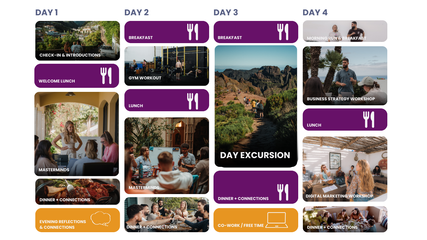 Each day, you'll have a few hours of free time. This is your opportunity to catch up on work if needed, deepen the connections or explore the destination.