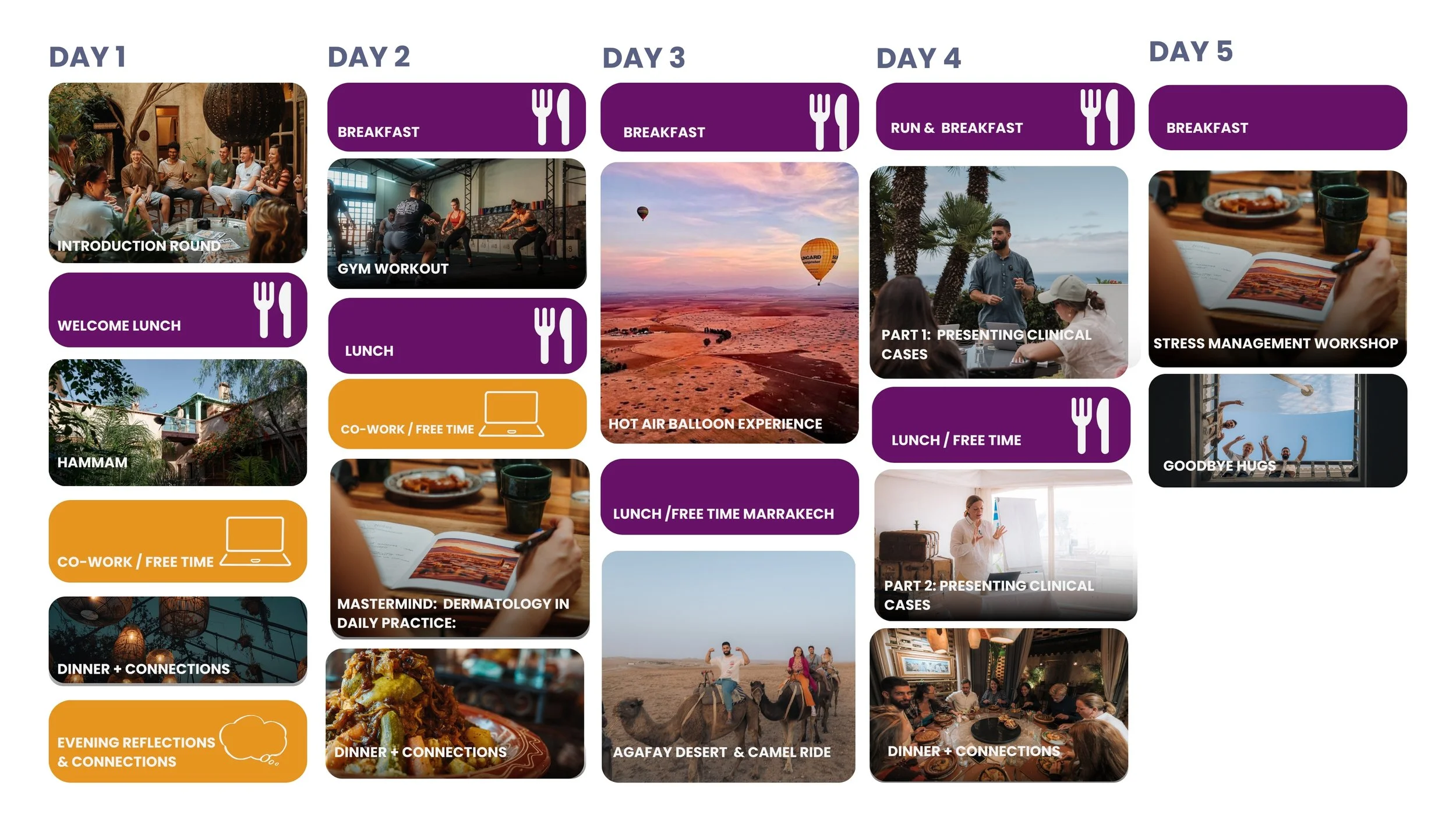 Each day, you'll have a few hours of free time. This is your opportunity to catch up on work if needed, deepen the connections or explore the destination.